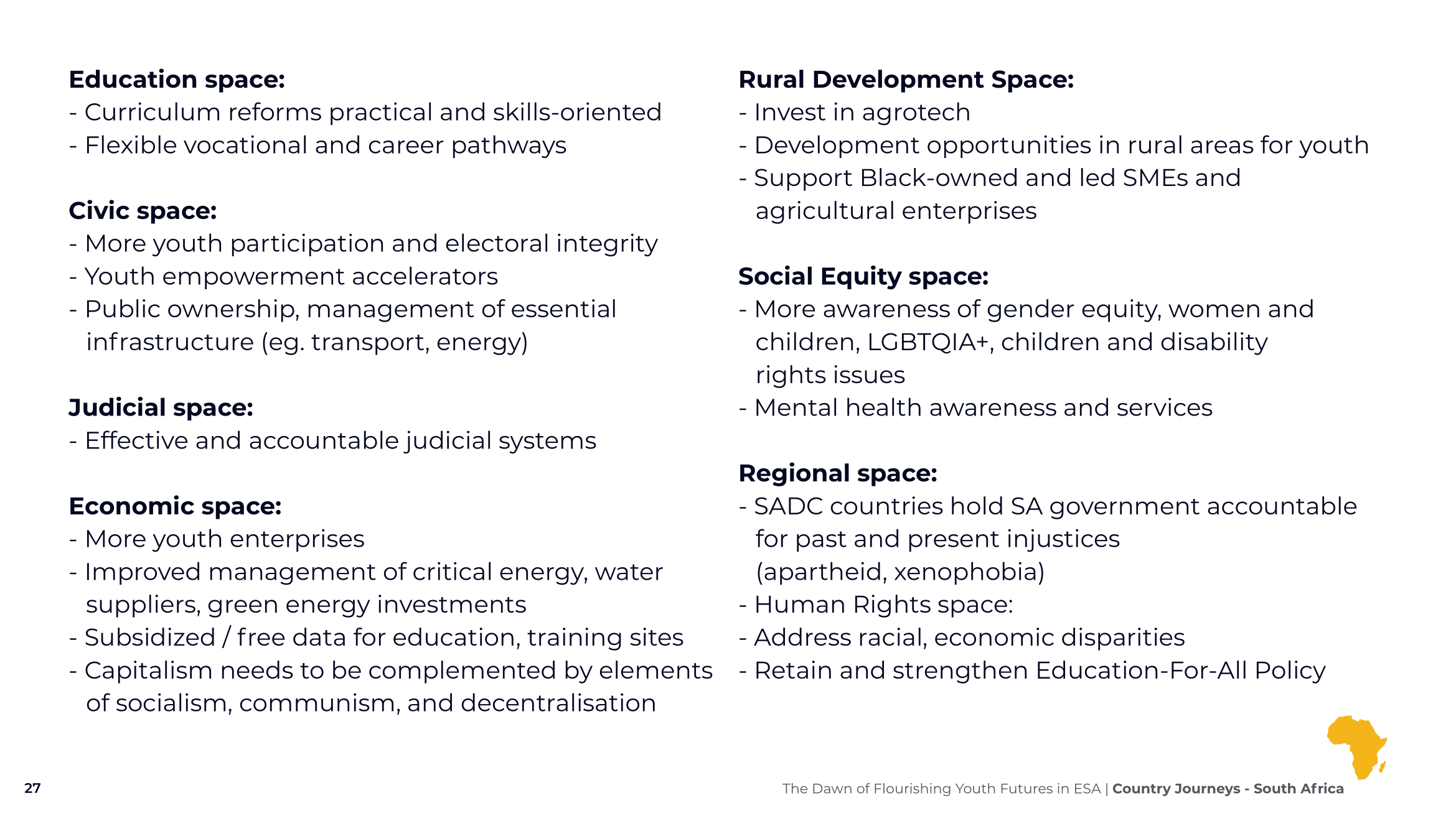 Empowered youth, social and economic equality, justice, safety, security, democratic values, and an end to marginalisation based on race and identity enabled prosperous futures for South African society.