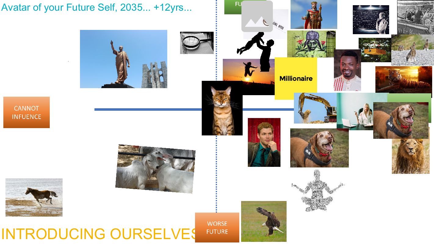Our first experiment in the Futures Literacy Lab was designed to explore futures orientations. Ugandan youth were invited to share if they thought the futures would be better or worse, and to choose an avatar that represents them in the year 2035. Most youth participants thought the futures are brighter and to varying degrees, they could influence them. Their images include happy people, “Millionaire”, but no predominant themes.